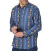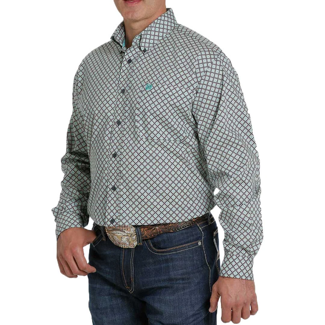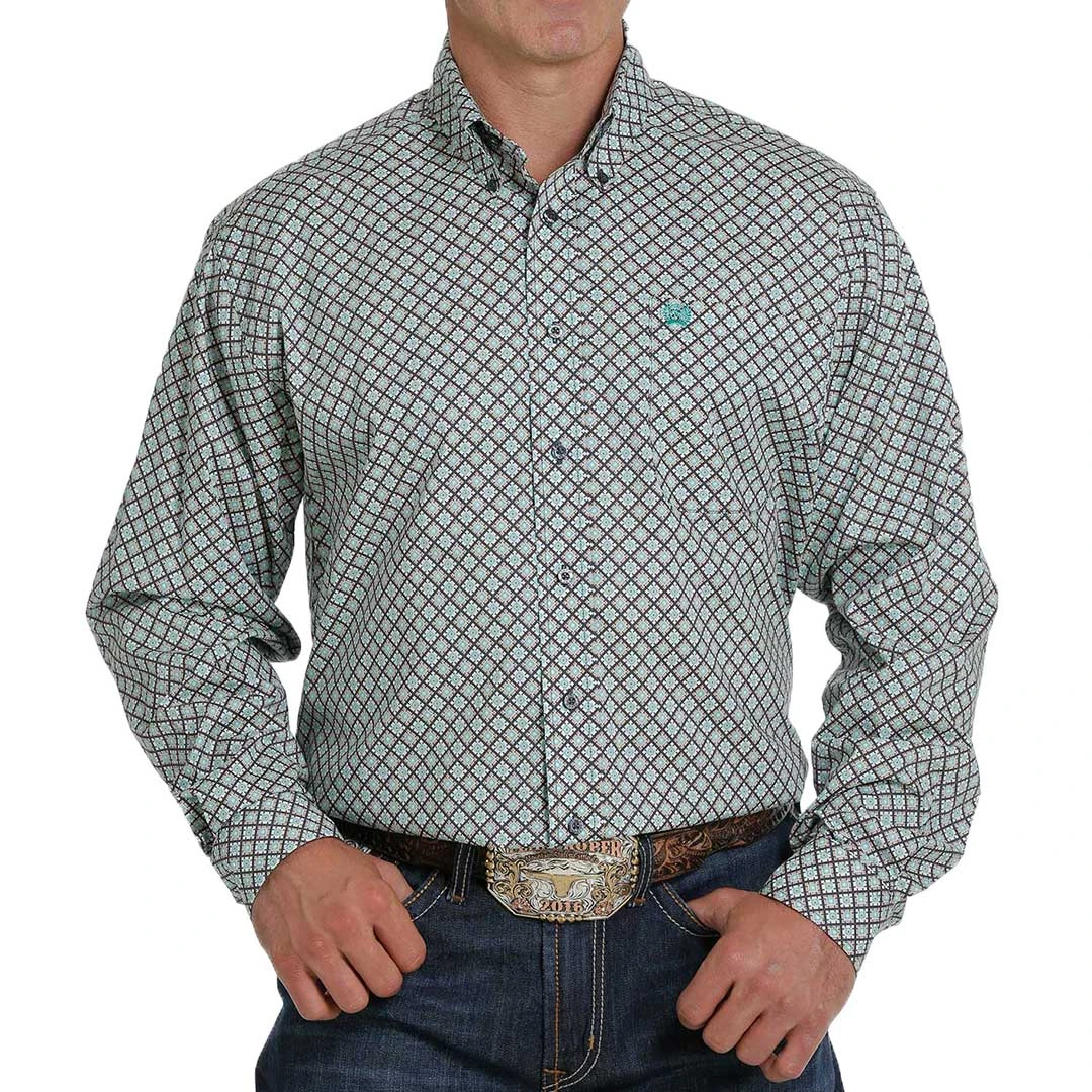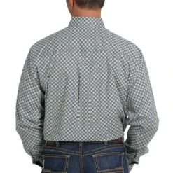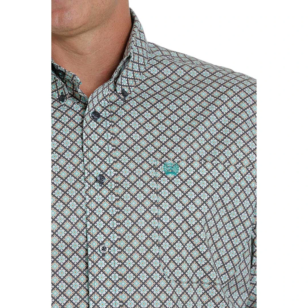 From Cinch, this western style turquoise and grey geometric print long sleeve shirt features a button-down collar, single left chest pocket with logo embroidery, straight back yoke with pleat and charcoal buttons.