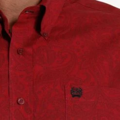 Featuring a classic paisley print in a bold burgundy colour, this Cinch brand cotton plain weave keeps you comfortable and in style at the office or the ranch. Design details include an open left front pocket with embroidered logo and burgundy buttons.