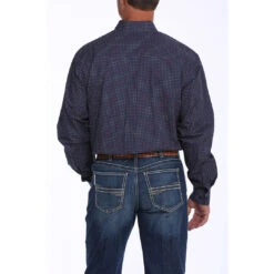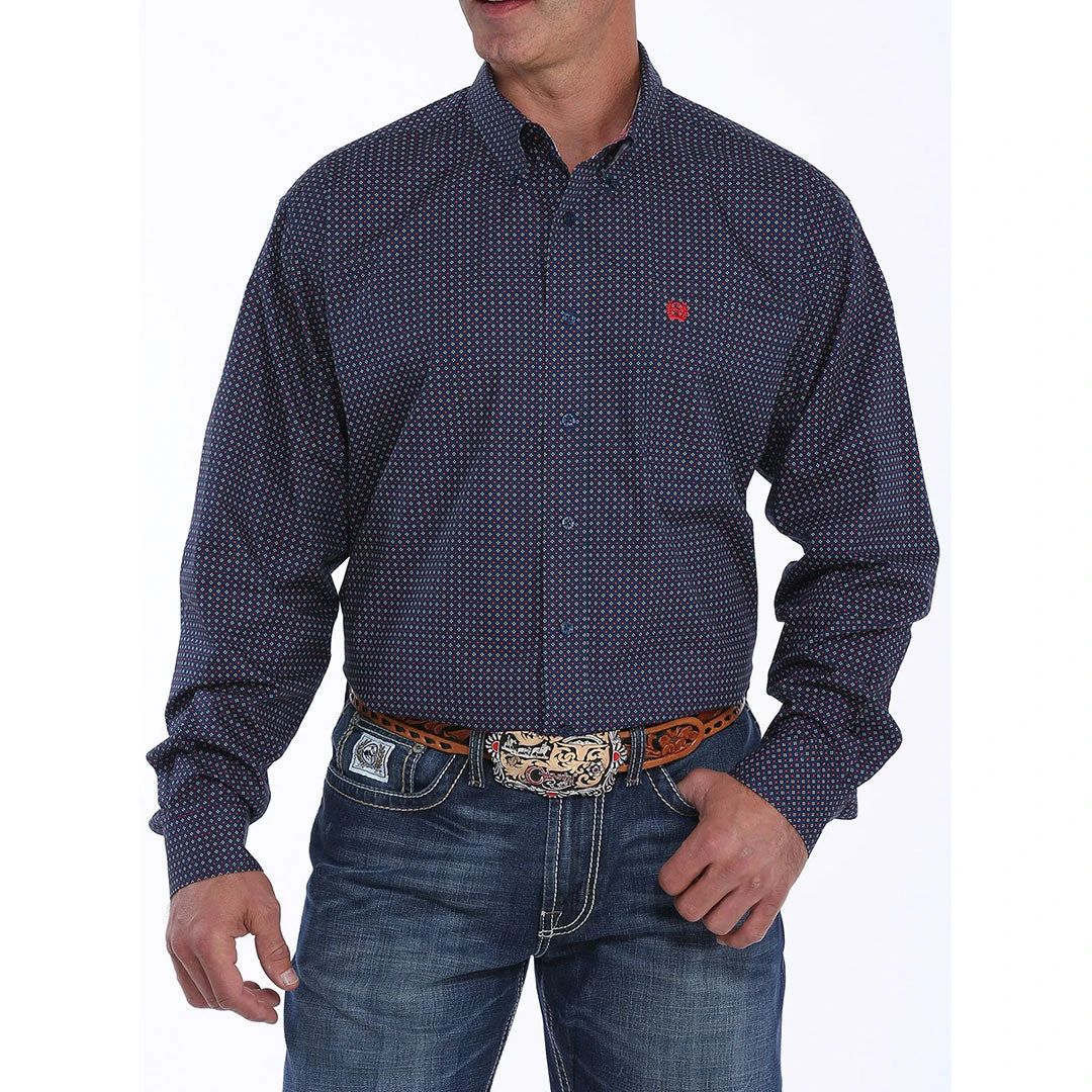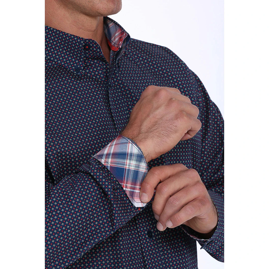 Like the idea of a trendy navy and red geometric patterned button down trimmed in classic plaid? This CINCH brand winner is for you. Accented with navy buttons, our long-sleeved shirt makes the perfect go-anywhere choice.