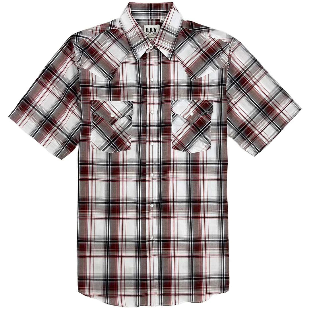 This great looking short sleeve plaid is enhanced by a textured arrow dobby design woven into Easy Care fabric. Features include snap flap pockets, front and back western yokes, pearl snaps and 3 snap cuffs.