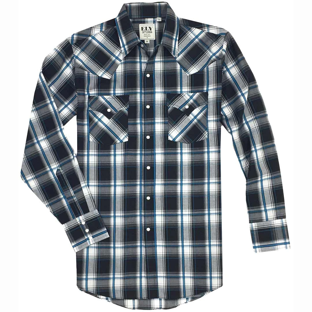The classic! This rich looking plaid shirt from Ely Cattleman features pearlized western snaps, front and back western yokes and two front flap pockets with snaps.