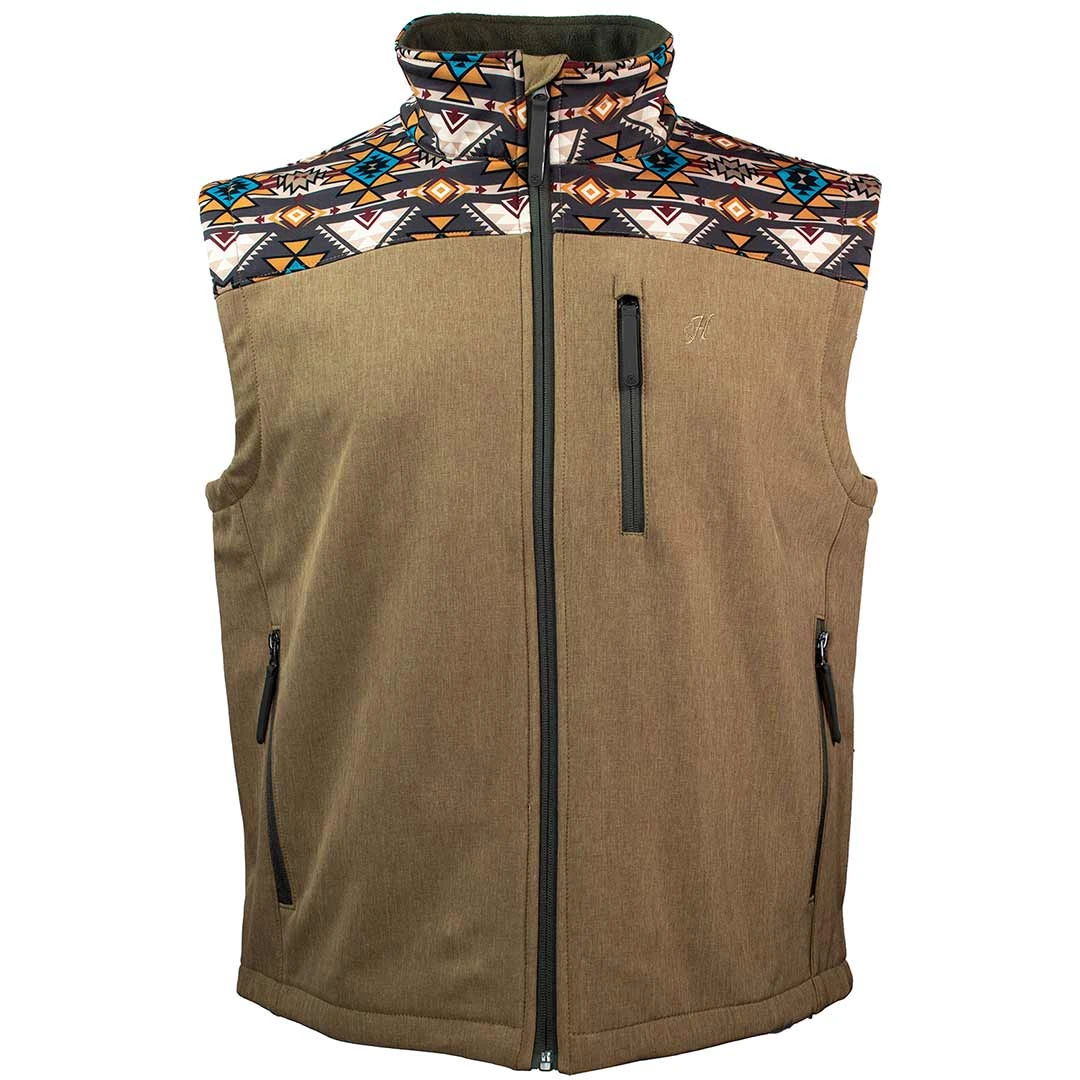 Ultimate performance; all weather protection. This Hooey tan with Aztec detailing men’s softshell fleece vest is perfect for cool or cold weather. Combat the wind or rain with this durable vest, featuring multifunctional hidden pockets and a headphone holster. Casual wear for your everyday tasks.