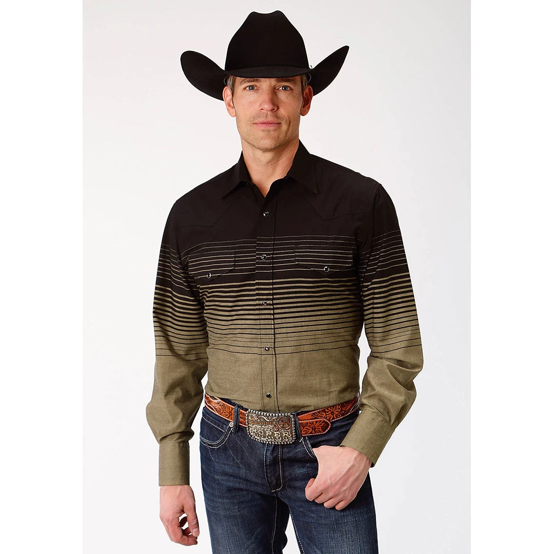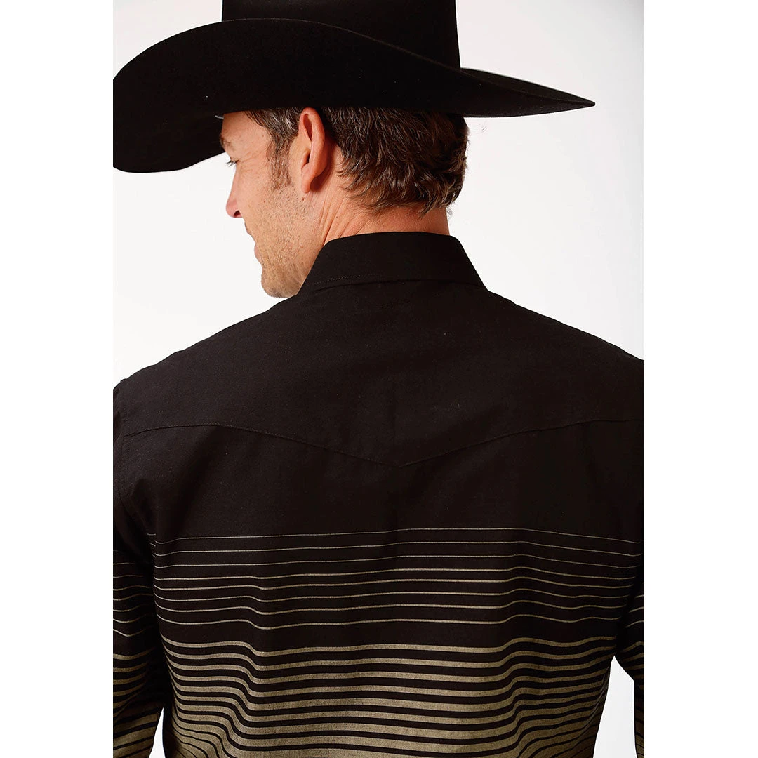 From Roper, this contrasting striped shirt is just the ticket to a trendy look for the office and any evening plans you might have. The shirt features an engineered border stripe, welt pockets with 1 point flaps and black pearl snaps.
