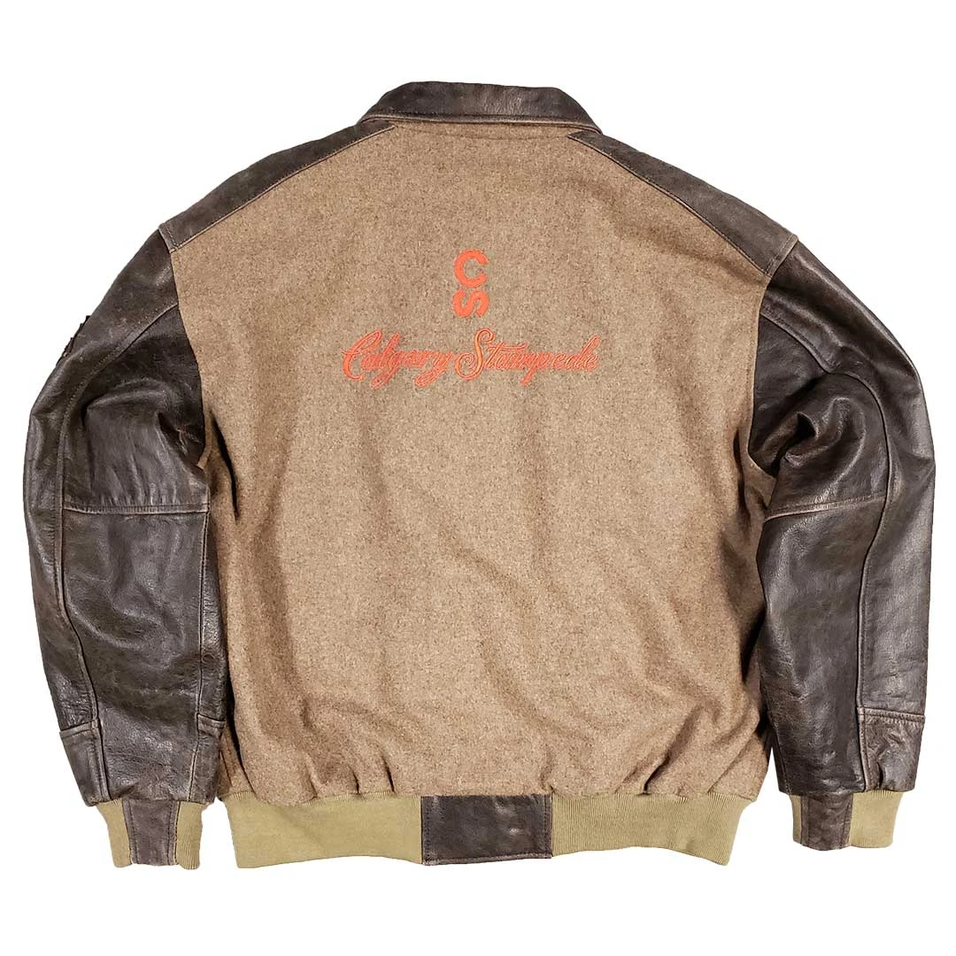Exclusive to the Calgary Stampede, this competitor jacket has a wool body with leather sleeves. It features a Limited Edition patch on the left arm and logo embroidery on the front and back. Combine your love for the Calgary Stampede and great style with this wool and leather jacket.
