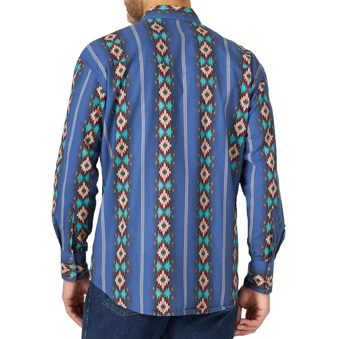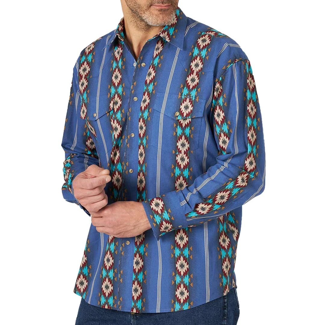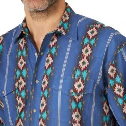 Wrangler’s Checotah has a home in the closets of cowboys around the world. This men’s Checotah long-sleeve western snap Navajo-inspired printed shirt is designed to make a statement no matter the destination. It features a classic fit, a spread collar, pointed yokes, two snap flap pockets with a convenient pencil slot, adjustable cuffs, and a full-length snap closure for the finishing touch. Best of all, it’s crafted from cotton for uncompromising comfort. Look sharp at a moment’s notice by wearing your Checotah shirt with a Wrangler Retro or Cowboy Cut jean.