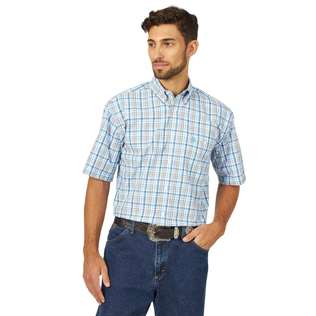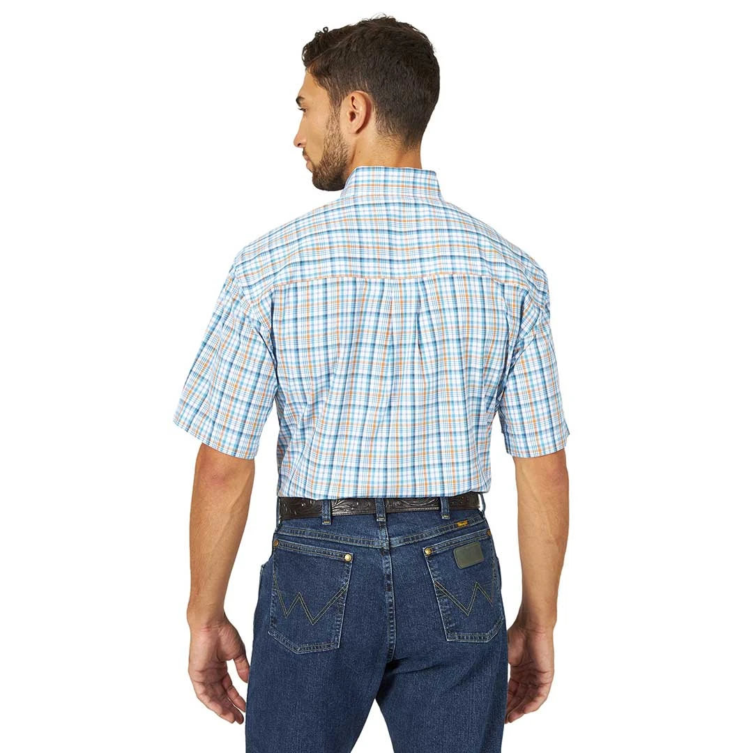 Keep it simple with the classic profile of this short sleeve button-down shirt. Part of the George Strait collection, this shirt is full of the timeless style the “king of country” is known for. Its ¼” turned hem tails, straight back yoke with box pleat, and chest pocket add subtle detailing for a stylish look you’ll love. The classic blue and orange plaid finishes it off with a style that pairs perfectly with your Wrangler denim.
